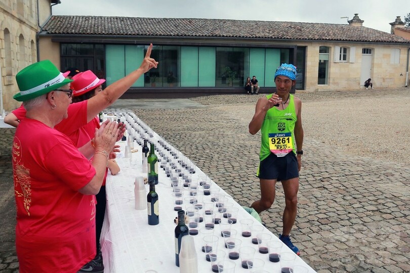 仏シャトー巡りマラソン、給水所ではワインを提供
