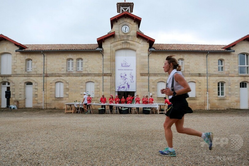 仏シャトー巡りマラソン、給水所ではワインを提供