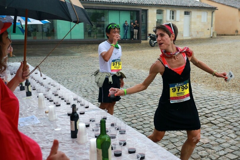 仏シャトー巡りマラソン、給水所ではワインを提供