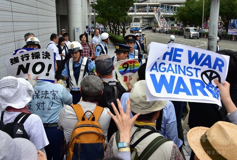 安倍政権は安全保障関連法案の成立を目指しているが、反対派は、安保法案が成立すれば70年続いた平和主義を損ない、第2次世界大戦(World War II)後初めて自衛隊が海外で戦闘を行うことになるかもしれないと主張している。(c)AFP