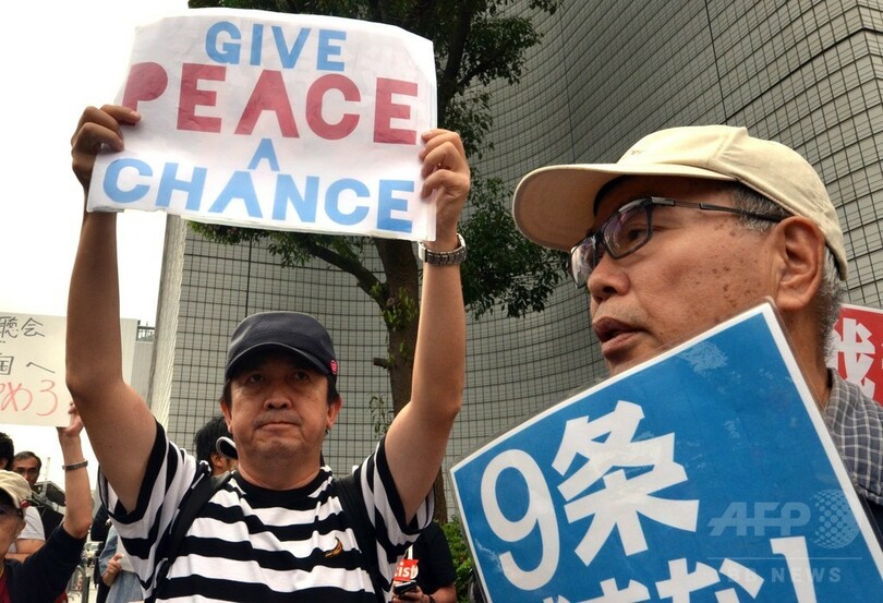 安倍政権は安全保障関連法案の成立を目指しているが、反対派は、安保法案が成立すれば70年続いた平和主義を損ない、第2次世界大戦(World War II)後初めて自衛隊が海外で戦闘を行うことになるかもしれないと主張している。(c)AFP