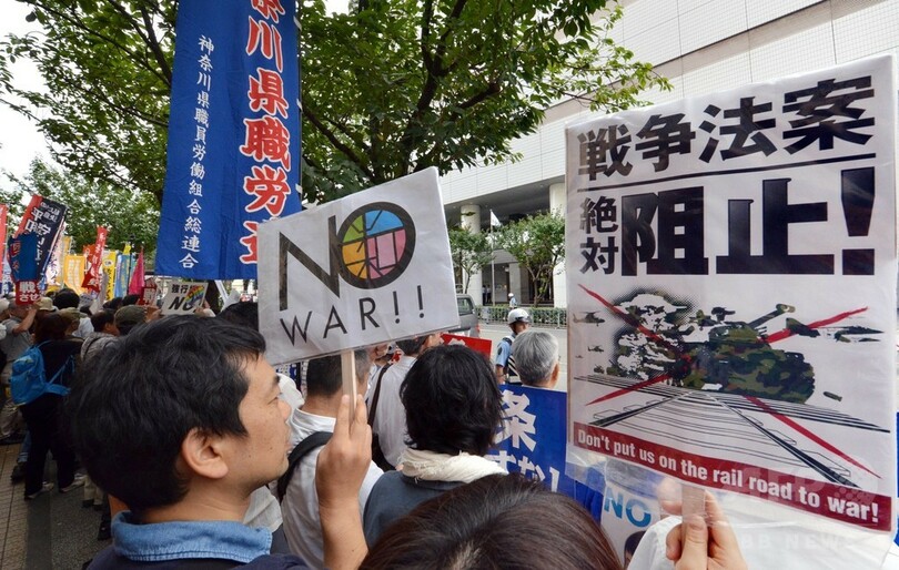 安倍政権は安全保障関連法案の成立を目指しているが、反対派は、安保法案が成立すれば70年続いた平和主義を損ない、第2次世界大戦(World War II)後初めて自衛隊が海外で戦闘を行うことになるかもしれないと主張している。(c)AFP