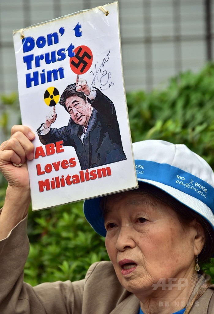【9月16日 AFP】(一部更新、写真追加)横浜市で16日、安全保障関連法案に関する地方公聴会が行われ、会場前には安倍晋三(Shinzo Abe)首相に抗議するプラカードを掲げる人たちが集まった。