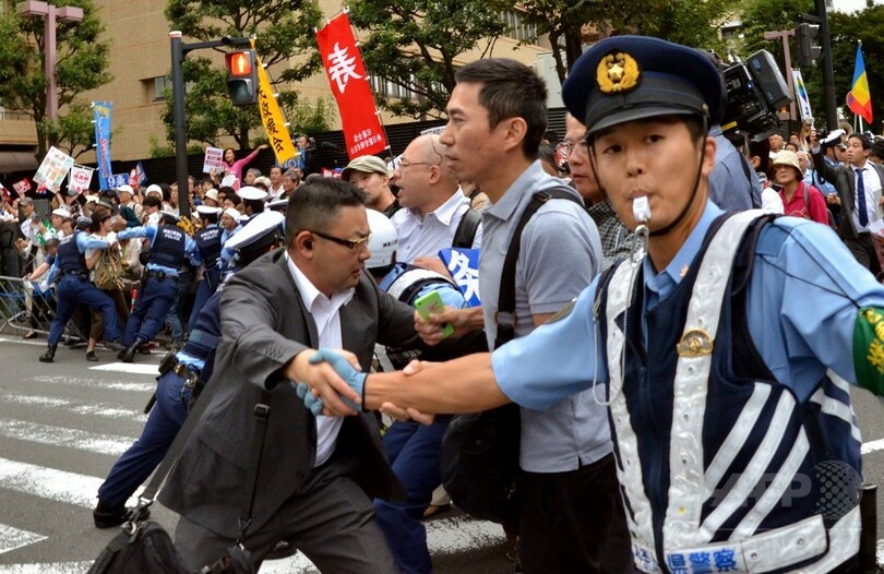 安倍政権は安全保障関連法案の成立を目指しているが、反対派は、安保法案が成立すれば70年続いた平和主義を損ない、第2次世界大戦(World War II)後初めて自衛隊が海外で戦闘を行うことになるかもしれないと主張している。(c)AFP