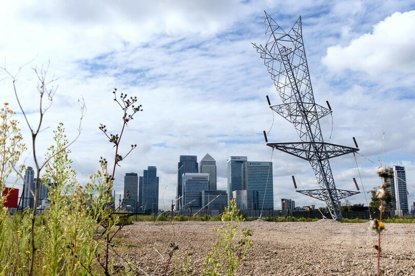鉄塔を上下逆さにひっくり返した外観のこの作品は、高さ35メートルで、ロンドン東部のウオーターフロント再開発地区、カナリーワーフ(Canary Wharf)からもその姿を目にすることができるという。(c)AFP
