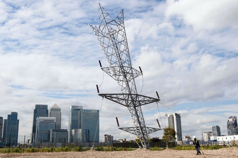 鉄塔を上下逆さにひっくり返した外観のこの作品は、高さ35メートルで、ロンドン東部のウオーターフロント再開発地区、カナリーワーフ(Canary Wharf)からもその姿を目にすることができるという。(c)AFP