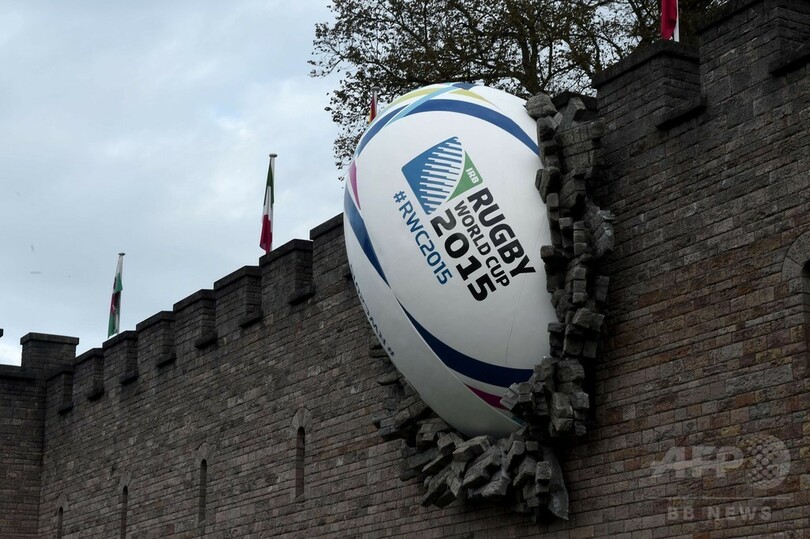 【9月19日 AFP】英ウェールズ(Wales)のカーディフ(Cardiff)にある観光名所カーディフ城(Cardiff Castle)で18日、城壁にめりこんだ巨大なラグビーボールが登場し、道行く人の目を楽しませている。ラグビーW杯イングランド大会(Rugby World Cup 2015)の開幕にあわせてお披露目された。(c)AFP