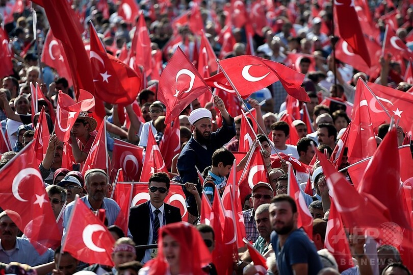 赤を基調としたトルコ国旗が揺れ動く中に政党や政派のシンボルは見あたらなかったが、参加者の多くはエルドアン大統領率いるイスラム系の公正発展党(Justice and Development Party、AKP)に対する熱烈な支持を表明した。