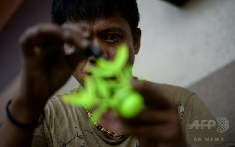 【9月23日 AFP】フィリピン・マニラ(Manila)の路地で、使用済みのペットボトルを用いて制作した造花を、1米ドル(約120円)前後で販売する元工芸職人の男性。