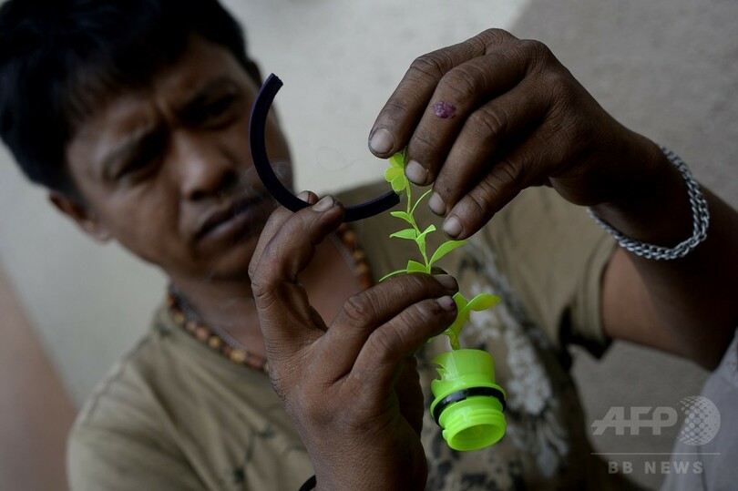 【9月23日 AFP】フィリピン・マニラ(Manila)の路地で、使用済みのペットボトルを用いて制作した造花を、1米ドル(約120円)前後で販売する元工芸職人の男性。