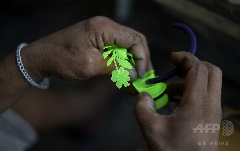【9月23日 AFP】フィリピン・マニラ(Manila)の路地で、使用済みのペットボトルを用いて制作した造花を、1米ドル(約120円)前後で販売する元工芸職人の男性。