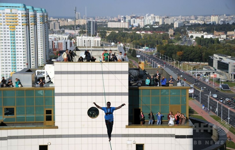 【9月24日 AFP】ベラルーシの首都ミンスク(Minsk)で23日、ウクライナの綱渡り名人、スタニスラフ・パニュータ(Stanislav Panyuta)さんが、ビルの屋上からの綱渡りを披露した。(c)AFP