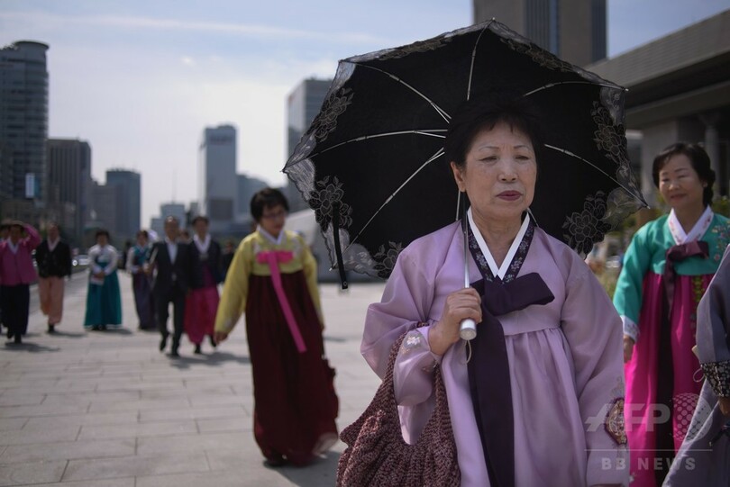 【9月24日 AFP】韓国の首都ソウル(Seoul)中心部にある光化門(Gwanghwamun)広場で24日、伝統衣装「韓服」のプロモーションイベントが開かれ、韓服を着た多くの人々がパレードに参加した。