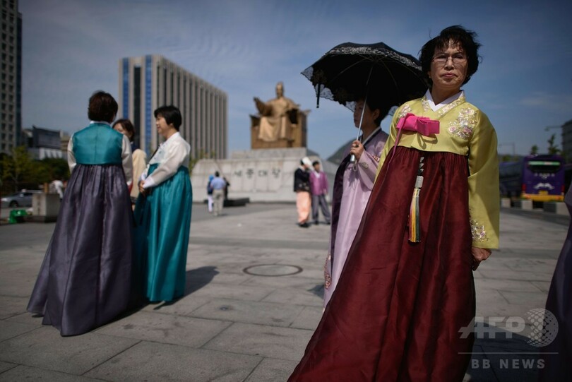 【9月24日 AFP】韓国の首都ソウル(Seoul)中心部にある光化門(Gwanghwamun)広場で24日、伝統衣装「韓服」のプロモーションイベントが開かれ、韓服を着た多くの人々がパレードに参加した。