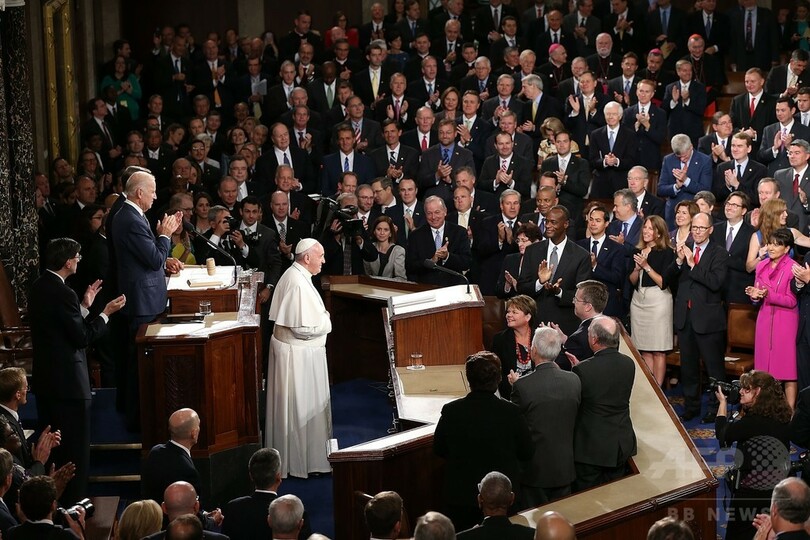 【9月25日 AFP】訪米中のローマ・カトリック教会のフランシスコ(Francis)法王は24日、首都ワシントン(Washington D.C.)の議会で演説し、紛争や貧困を逃れる人々への支援や、気候変動対策への取り組みを呼び掛けるなど、米国と世界の大きな政治問題の数々に言及した。