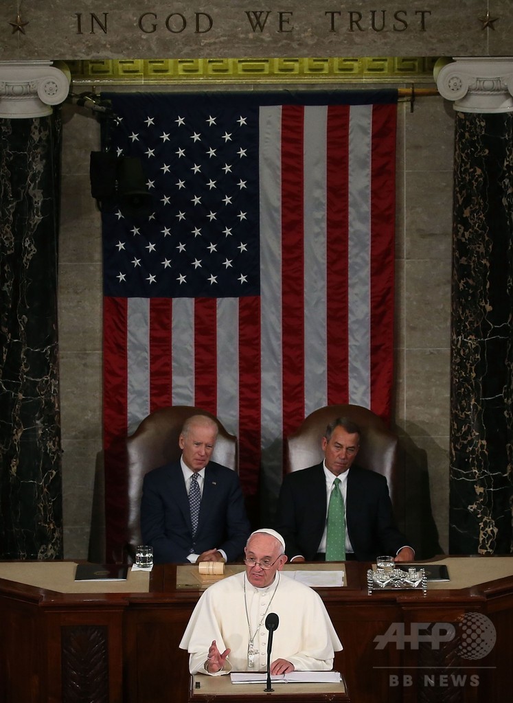 【9月25日 AFP】訪米中のローマ・カトリック教会のフランシスコ(Francis)法王は24日、首都ワシントン(Washington D.C.)の議会で演説し、紛争や貧困を逃れる人々への支援や、気候変動対策への取り組みを呼び掛けるなど、米国と世界の大きな政治問題の数々に言及した。