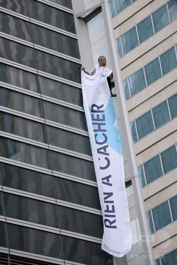 ロベールさんは昨年、同地区で仏石油大手トタル(Total)の本社ビル(高さ186メートル)「登頂」に成功しているが、今回登ったのは仏エネルギー会社大手エンジー(Engie)のビル。ロベールさんはエンジーのビルから「隠すものは何もない」と書かれた垂れ幕を下げた。(c)AFP