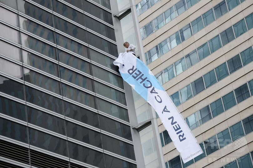 ロベールさんは昨年、同地区で仏石油大手トタル(Total)の本社ビル(高さ186メートル)「登頂」に成功しているが、今回登ったのは仏エネルギー会社大手エンジー(Engie)のビル。ロベールさんはエンジーのビルから「隠すものは何もない」と書かれた垂れ幕を下げた。(c)AFP
