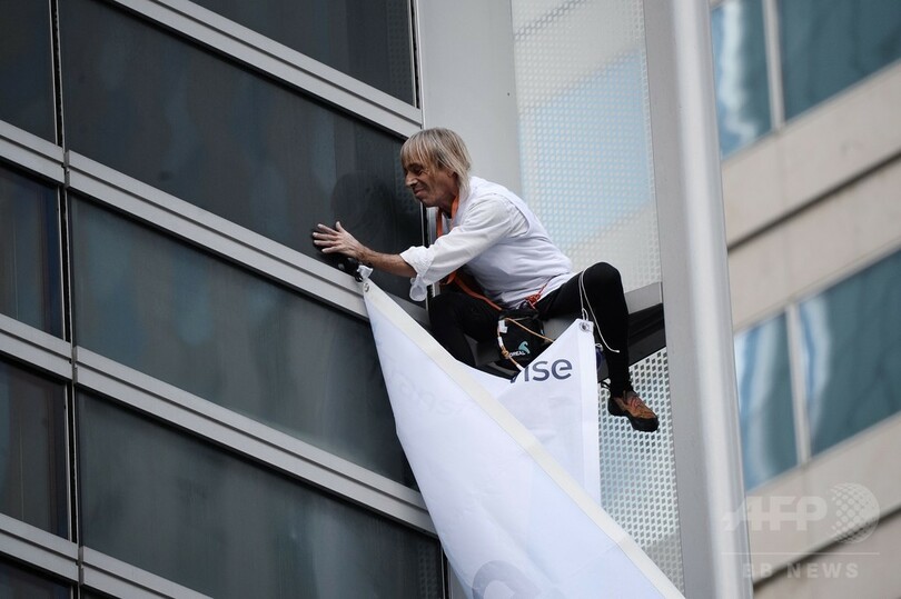 【9月25日 AFP】世界各地の高層建築に登り「スパイダーマン(Spiderman)」の異名を持つ仏人フリークライマー、アラン・ロベール(Alain Robert)さんが23日、仏パリ(Paris)近郊のビジネス地区ラ・デファンス(La Defense)にある高層ビルに登った。