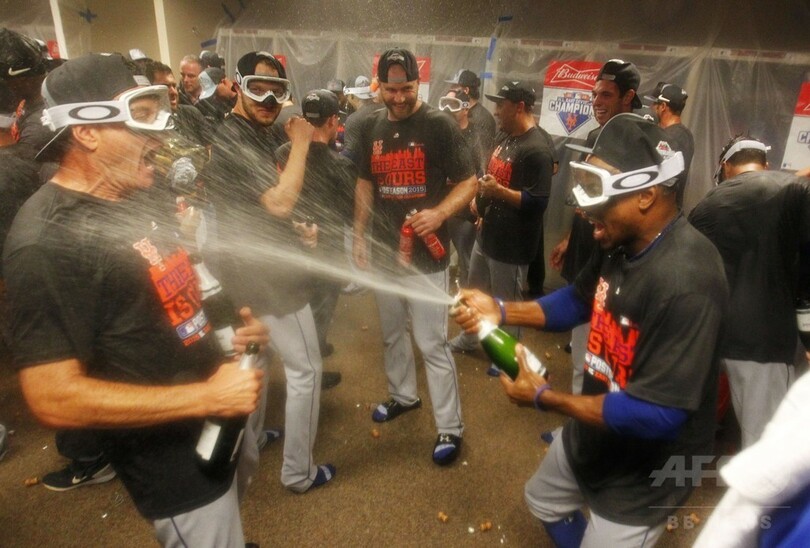 抑え投手のジェウリス・ファミリア(Jeurys Familia)が最後の打者を三振に切って取ると、選手たちは比較的穏やかに優勝を喜んだ。ダッグアウトの選手たちが小走りでマウンドへ集まると、その後はロッカールームでシャンパンを振った。(c)AFP