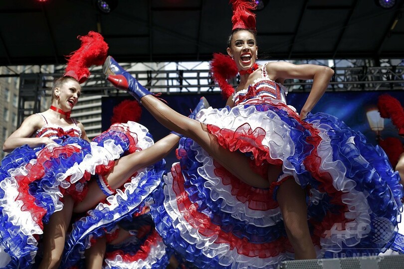 【9月27日 AFP】フランス・パリ(Paris)の老舗キャバレー「ムーランルージュ(Moulin Rouge)」の踊り子たちが25日、米ニューヨーク(New York)のタイムズ・スクエア(Times Square)に設けられたステージで華麗なダンスを披露した。仏文化のプロモーション活動「ベスト・オブ・フランス(Best of France)」の一環で行われたイベント。(c)AFP