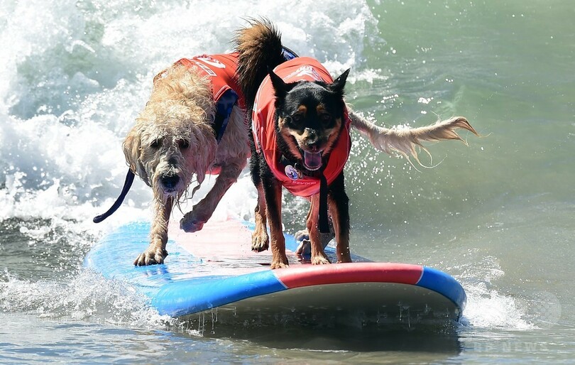 見事な波さばき、サーファー犬が技競う 米
