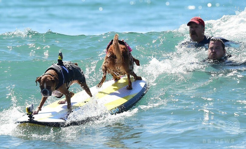 見事な波さばき、サーファー犬が技競う 米