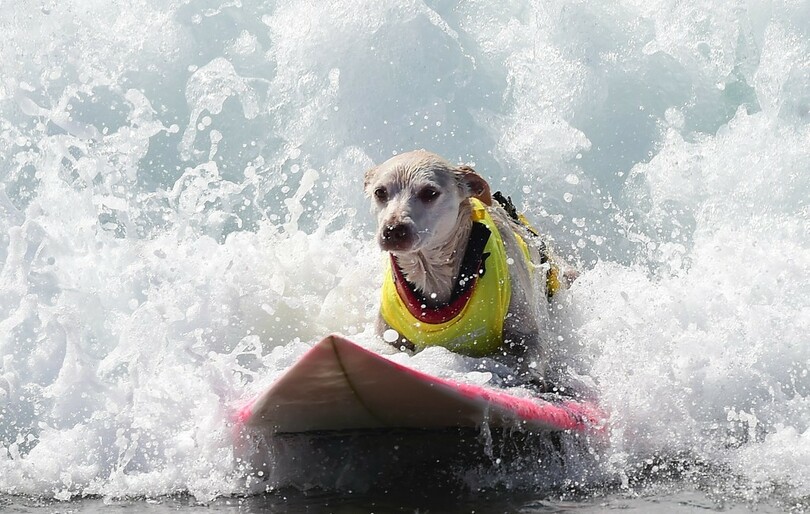見事な波さばき、サーファー犬が技競う 米