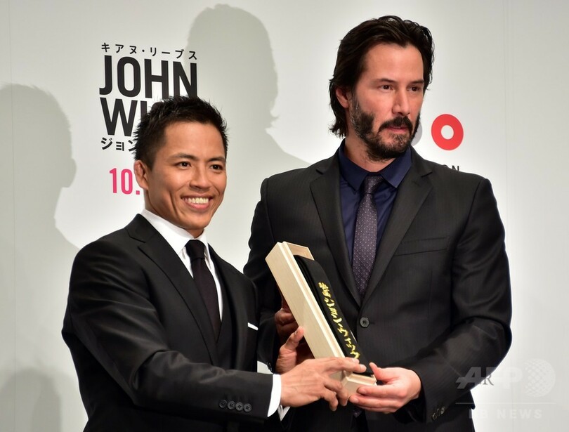 【10月1日 AFP】来日中の米俳優キアヌ・リーヴス(Keanu Reeves)が9月30日、都内で開かれた主演映画『ジョン・ウィック(John Wick)』のジャパンプレミアに出席した。会場には柔道金メダリストの野村忠宏(Tadahiro Nomura)さんが訪れ、キアヌに「黒帯」を贈った。同作は今月16日に全国公開される。(c)AFP