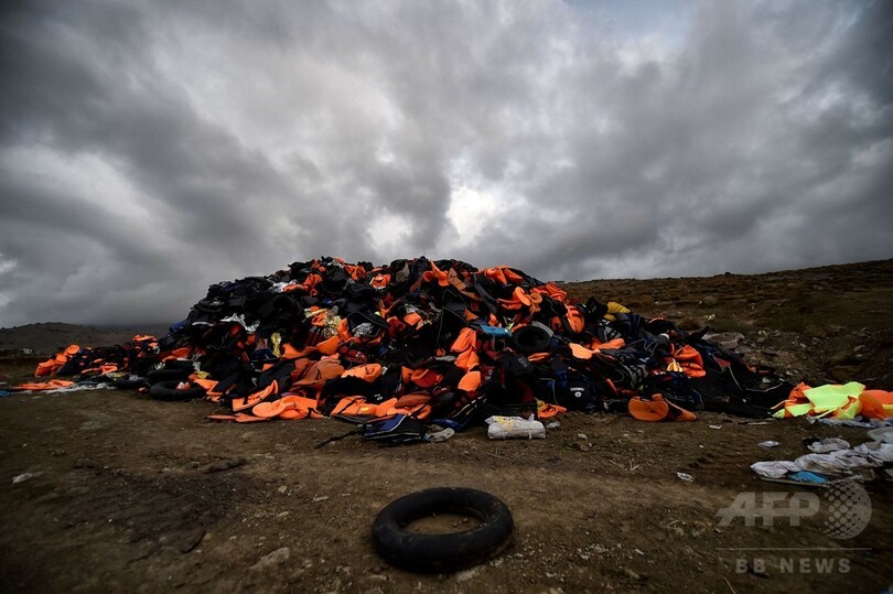 移民の上陸地点となっているレスボス島北部沿岸スカラシカミニアス(Skala Sikaminias)では、市職員らが浜辺に放置された救命胴衣とゴムボートをトラックに積み込んで撤去している。廃棄物処理担当の当局者は、「終わってもまたどこかに積み上がっているので、きりがない」とため息をついた。