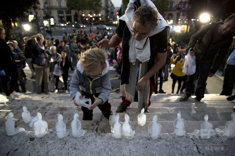 パリの街に氷の小像、夜の芸術祭「ニュイ・ブランシュ」