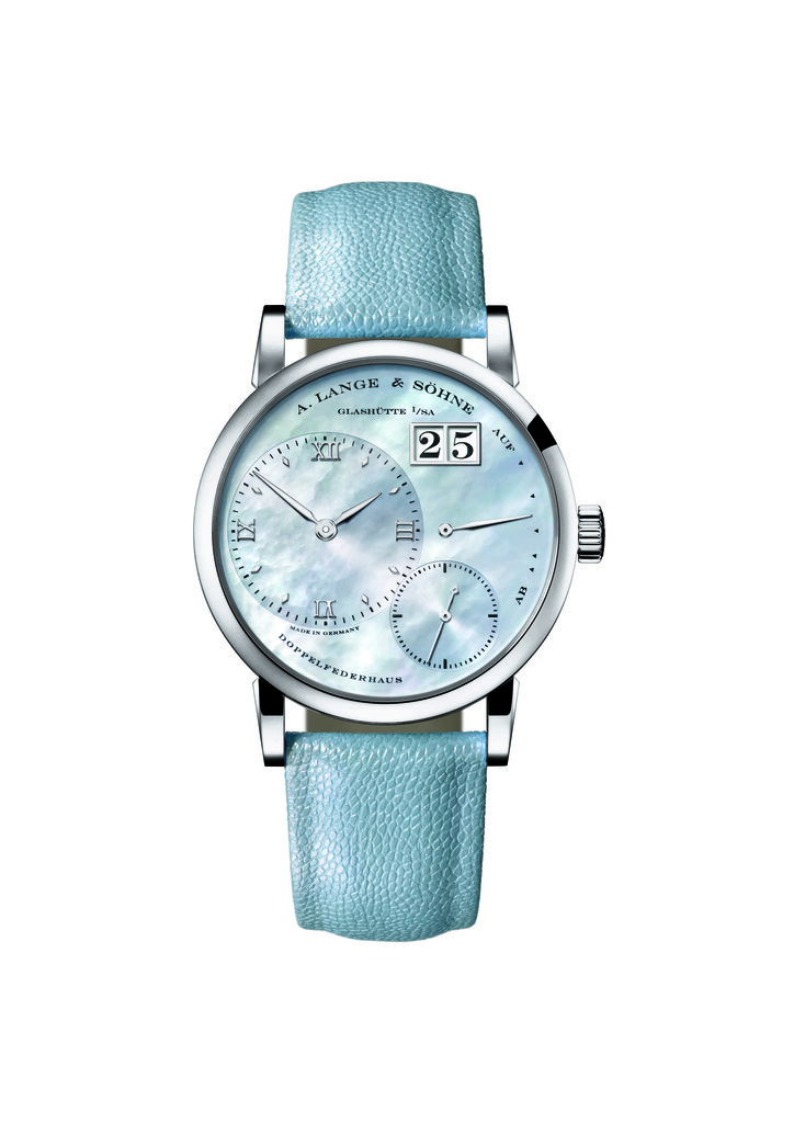 デザインに定評のある「リトル・ランゲ1」には、下層のブルーが透けて見えるマザーオブパール製ダイヤルのフェミニンなバリエーションが加わった。