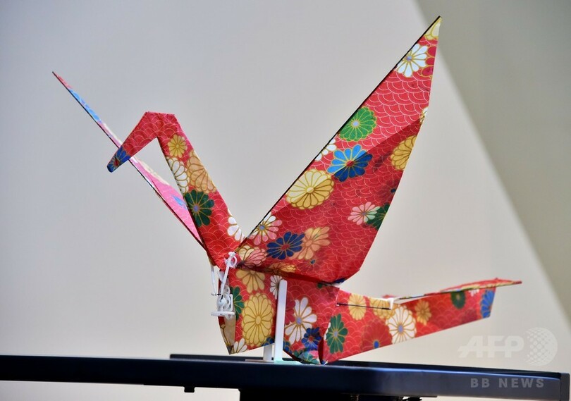 【10月7日 AFP】千葉県の幕張メッセで7日、アジア最大級のIT・エレクトロニクス見本市「CEATEC JAPAN(シーテックジャパン)2015」が開幕した。会場には、半導体・電子部品メーカー「ローム(ROHM)」の、ラジコン制御可能な空飛ぶ折り鶴型飛行体「ORIZURU」などが展示された。「ORIZURU」はわずか31グラムで、翼をはためかせて飛行する。(c)AFP/Yoshikazu TSUNO
