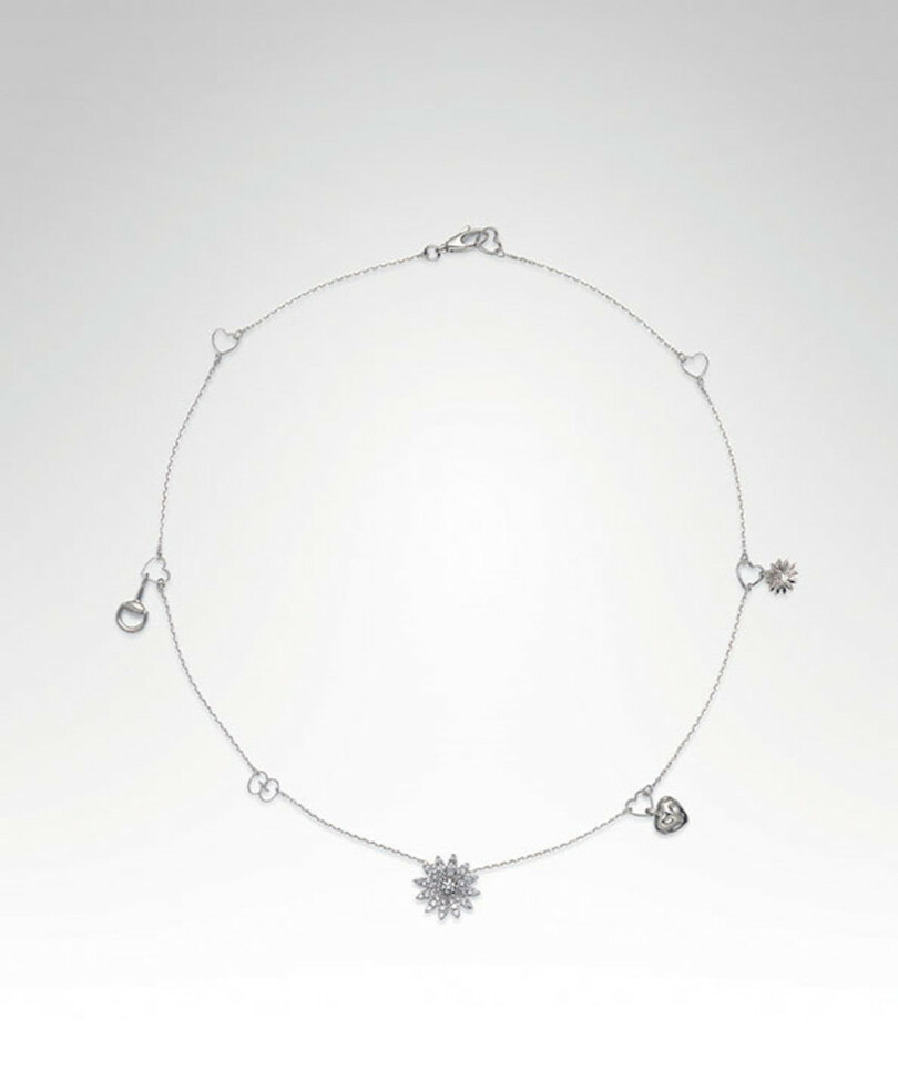 1966年にシルクスカーフに描かれて以来、愛され続けているグッチのアイコン「フローラ」プリントにインスピレーションを得てデザインされた同ジュエリーは、繊細でエレガントなデザイン。18Kホワイトゴールドにダイヤモンド、ピンクゴールドにピンクサファイアやルビーをあしらった、プレシャスなネックレス、イヤリング、リングが揃っている。
