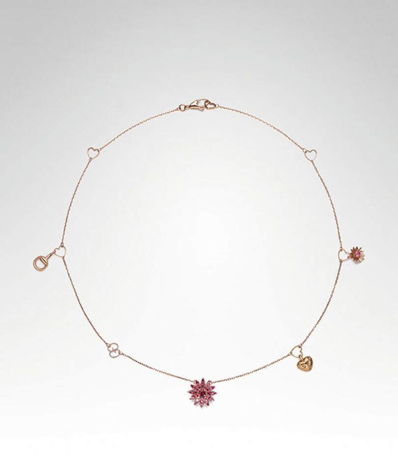 1966年にシルクスカーフに描かれて以来、愛され続けているグッチのアイコン「フローラ」プリントにインスピレーションを得てデザインされた同ジュエリーは、繊細でエレガントなデザイン。18Kホワイトゴールドにダイヤモンド、ピンクゴールドにピンクサファイアやルビーをあしらった、プレシャスなネックレス、イヤリング、リングが揃っている。