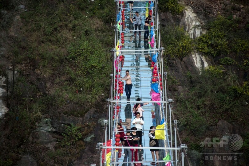 【10月8日 AFP】中国湖南(Hunan)省平江(Pingjang)県の石牛寨(Shiniuzhai)公園の渓谷に架けられた高さ180メートル、全長300メートルのガラス床面のつり橋。もとは木製の橋だったが、ガラス製に改修し、2週間前にオープンした。(c)AFP