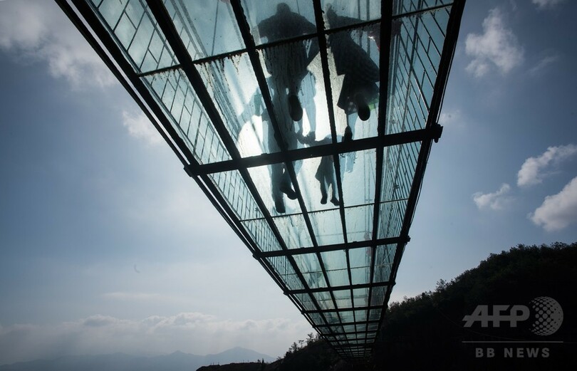 【10月8日 AFP】中国湖南(Hunan)省平江(Pingjang)県の石牛寨(Shiniuzhai)公園の渓谷に架けられた高さ180メートル、全長300メートルのガラス床面のつり橋。もとは木製の橋だったが、ガラス製に改修し、2週間前にオープンした。(c)AFP