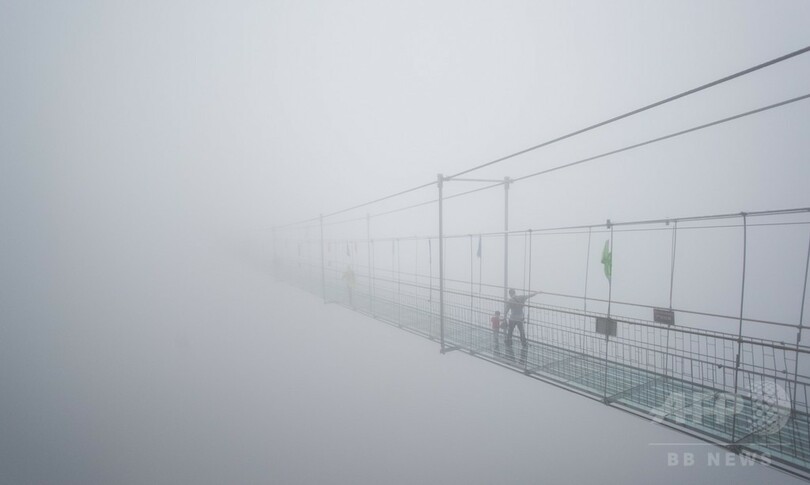 【10月8日 AFP】中国湖南(Hunan)省平江(Pingjang)県の石牛寨(Shiniuzhai)公園の渓谷に架けられた高さ180メートル、全長300メートルのガラス床面のつり橋。もとは木製の橋だったが、ガラス製に改修し、2週間前にオープンした。(c)AFP