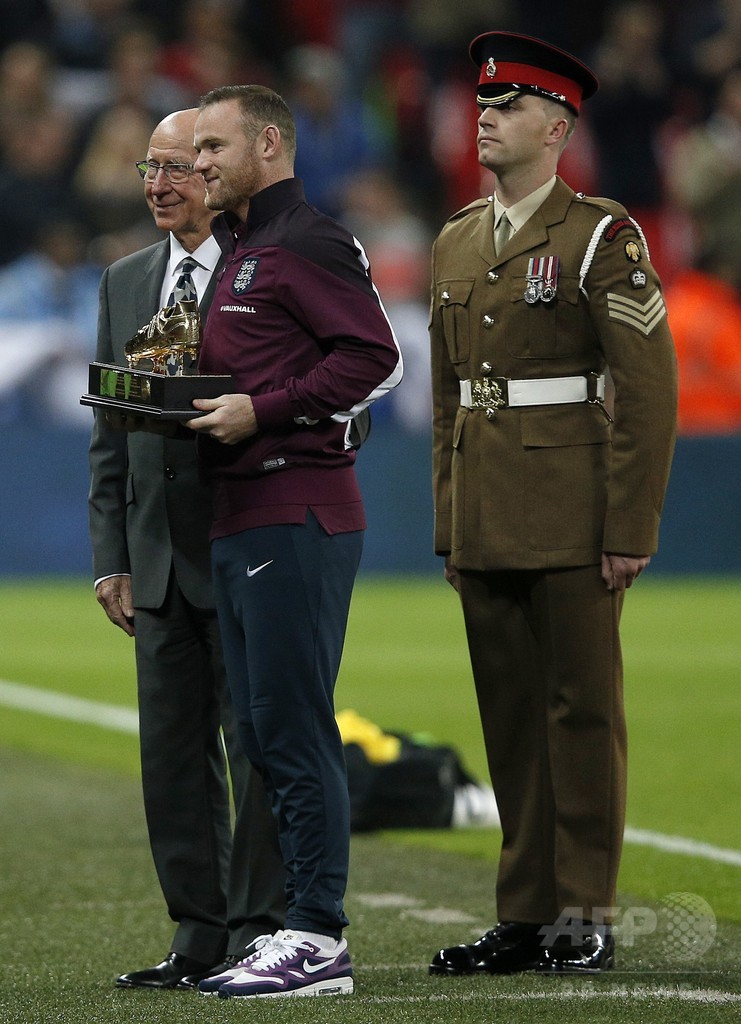【10月10日 AFP】イングランド代表の歴代最多得点記録を更新したウェイン・ルーニー(Wayne Rooney)が9日、ウェンブリー・スタジアム(Wembley Stadium)で行われたエストニアとの欧州選手権2016(UEFA Euro 2016)予選の試合前に、ゴールデンブーツを授与された。