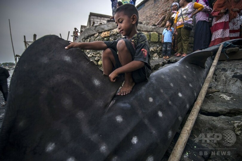 【10月15日 AFP】インドネシア・ジャワ(Java)島東部のスラバヤ(Surabaya)で12日、地元の漁師たちが巨大なジンベイザメの死骸を陸に引き上げた。地元の漁師たちは当初、全長7メートル、体重2トンのジンベイザメの死骸を解体・販売する予定だったが、駆けつけた水産当局者との話し合いの結果、死骸はそのまま埋められることになった。