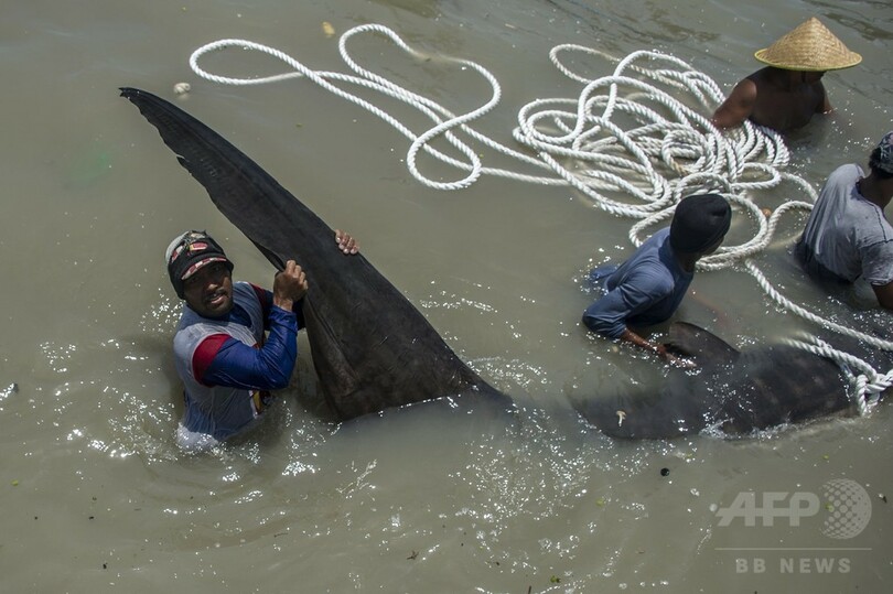 【10月15日 AFP】インドネシア・ジャワ(Java)島東部のスラバヤ(Surabaya)で12日、地元の漁師たちが巨大なジンベイザメの死骸を陸に引き上げた。地元の漁師たちは当初、全長7メートル、体重2トンのジンベイザメの死骸を解体・販売する予定だったが、駆けつけた水産当局者との話し合いの結果、死骸はそのまま埋められることになった。