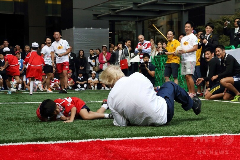【10月15日 AFP】訪日中のボリス・ジョンソン(Boris Johnson)ロンドン(London)市長が15日、都内で「2019年ラグビーW杯日本大会(Rugby World Cup 2019)」のプロモーションイベントに参加し、小学生たちとラグビーを楽しんだ。(c)AFP