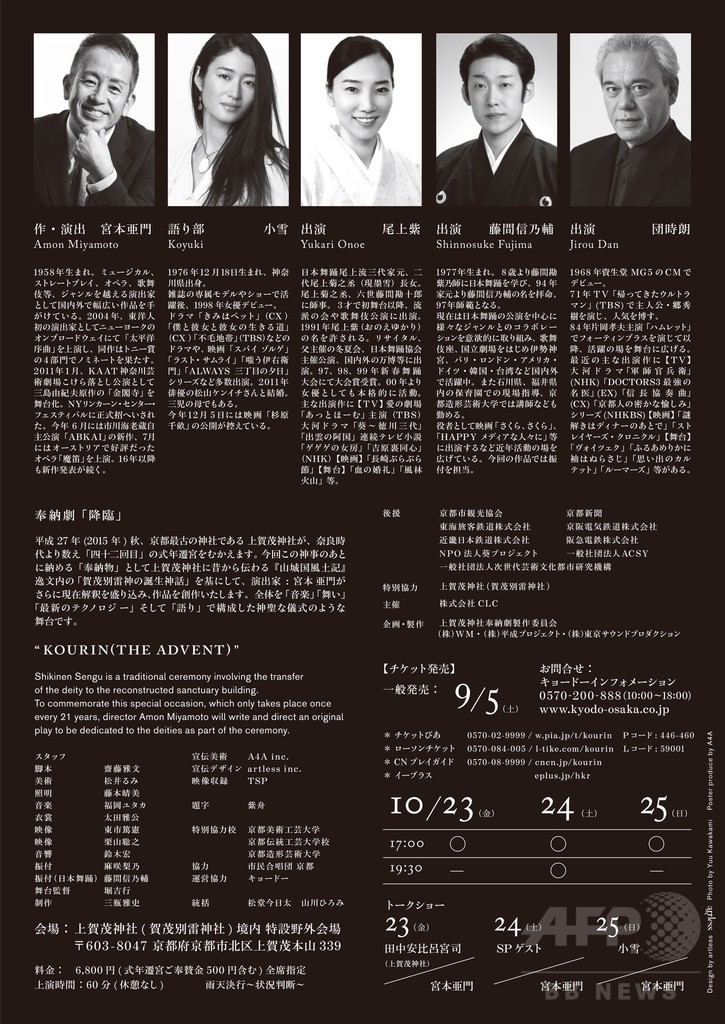 【10月21日 MODE PRESS WATCH】京都最古で世界遺産にも登録されている上賀茂神社の第42回目の式年遷宮に際し、特別な神事の後に納める奉納物として、演出家の宮本亜門(Amon Miyamoto)が劇を創作した。10月23日から25日までの3日間、同神社にて上演される。