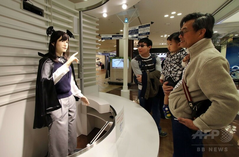 【10月26日 AFP】東芝(Toshiba)の人型ロボット「地平ジュンこ(Chihira Junko)」が26日、都内にある大型ショッピングセンター「アクアシティお台場」に、ハロウィーンのコスチューム姿で登場した。「ジュンこ」は日本語、英語、中国語の3か国語で来場客に案内を行うことができる。(c)AFP