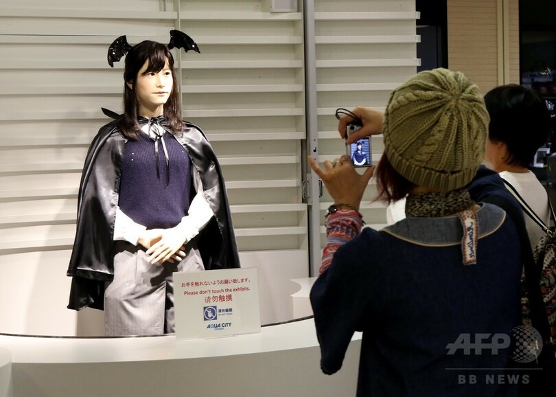 【10月26日 AFP】東芝(Toshiba)の人型ロボット「地平ジュンこ(Chihira Junko)」が26日、都内にある大型ショッピングセンター「アクアシティお台場」に、ハロウィーンのコスチューム姿で登場した。「ジュンこ」は日本語、英語、中国語の3か国語で来場客に案内を行うことができる。(c)AFP