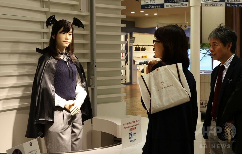 【10月26日 AFP】東芝(Toshiba)の人型ロボット「地平ジュンこ(Chihira Junko)」が26日、都内にある大型ショッピングセンター「アクアシティお台場」に、ハロウィーンのコスチューム姿で登場した。「ジュンこ」は日本語、英語、中国語の3か国語で来場客に案内を行うことができる。(c)AFP