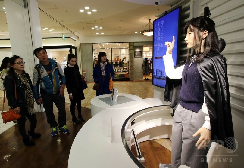 【10月26日 AFP】東芝(Toshiba)の人型ロボット「地平ジュンこ(Chihira Junko)」が26日、都内にある大型ショッピングセンター「アクアシティお台場」に、ハロウィーンのコスチューム姿で登場した。「ジュンこ」は日本語、英語、中国語の3か国語で来場客に案内を行うことができる。(c)AFP