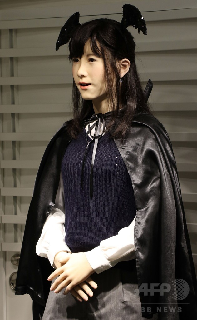 【10月26日 AFP】東芝(Toshiba)の人型ロボット「地平ジュンこ(Chihira Junko)」が26日、都内にある大型ショッピングセンター「アクアシティお台場」に、ハロウィーンのコスチューム姿で登場した。「ジュンこ」は日本語、英語、中国語の3か国語で来場客に案内を行うことができる。(c)AFP