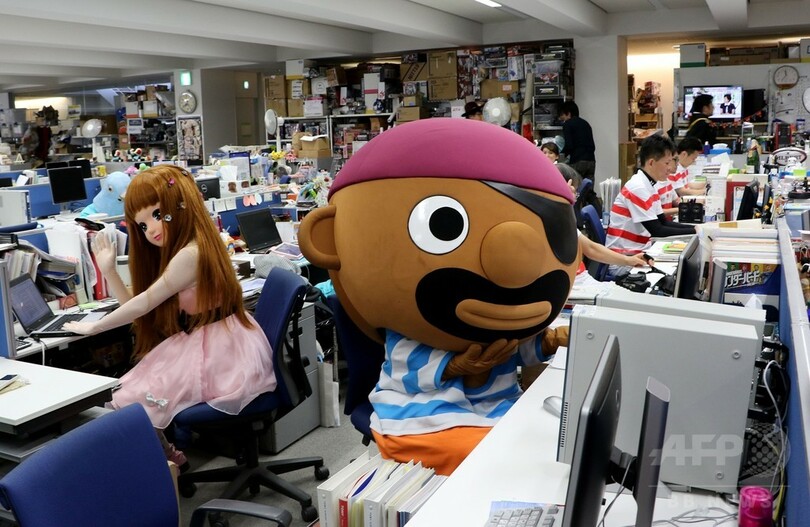 【10月28日 AFP】玩具大手タカラトミー(Takara Tomy)の都内本社で27日、社員が思い思いのコスチュームで通常業務にあたる「ハロウィーンデー」が行われた。ハロルド・メイ(Harold Meij)社長をはじめ社員たちが着せ替え人形「リカちゃん」や人気ゲーム「黒ひげ危機一発」のコスチュームに身を包み、イベントを楽しんだ。(c)AFP