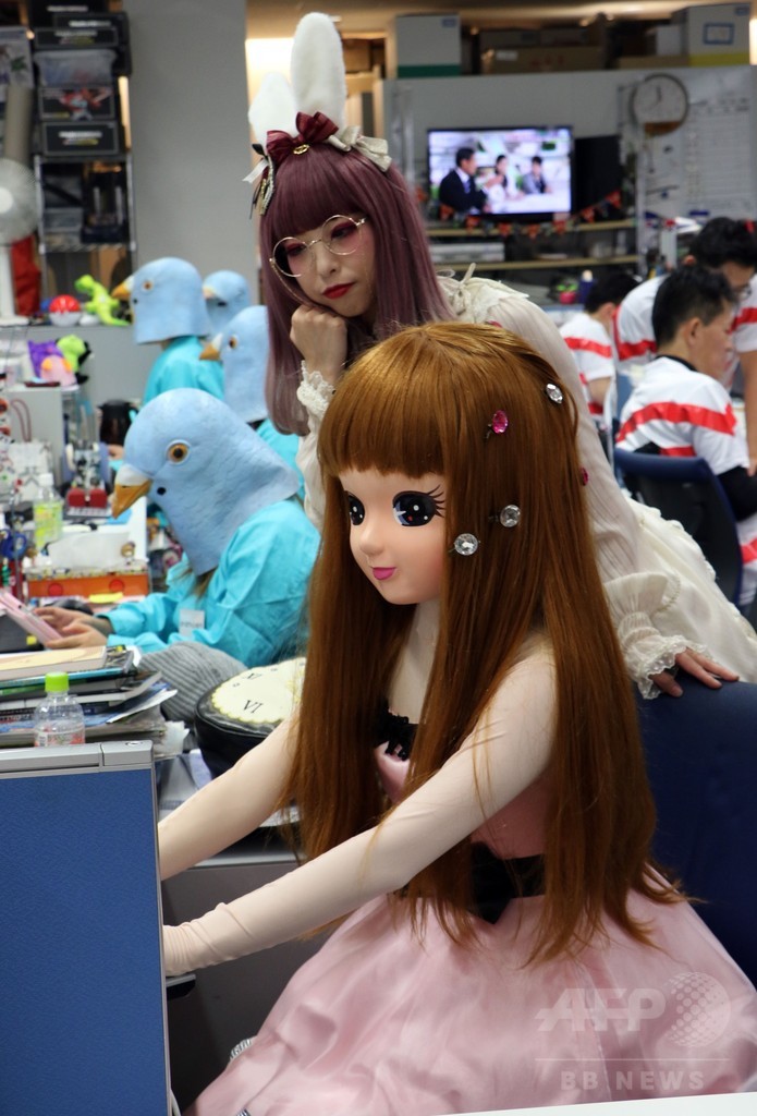 【10月28日 AFP】玩具大手タカラトミー(Takara Tomy)の都内本社で27日、社員が思い思いのコスチュームで通常業務にあたる「ハロウィーンデー」が行われた。ハロルド・メイ(Harold Meij)社長をはじめ社員たちが着せ替え人形「リカちゃん」や人気ゲーム「黒ひげ危機一発」のコスチュームに身を包み、イベントを楽しんだ。(c)AFP
